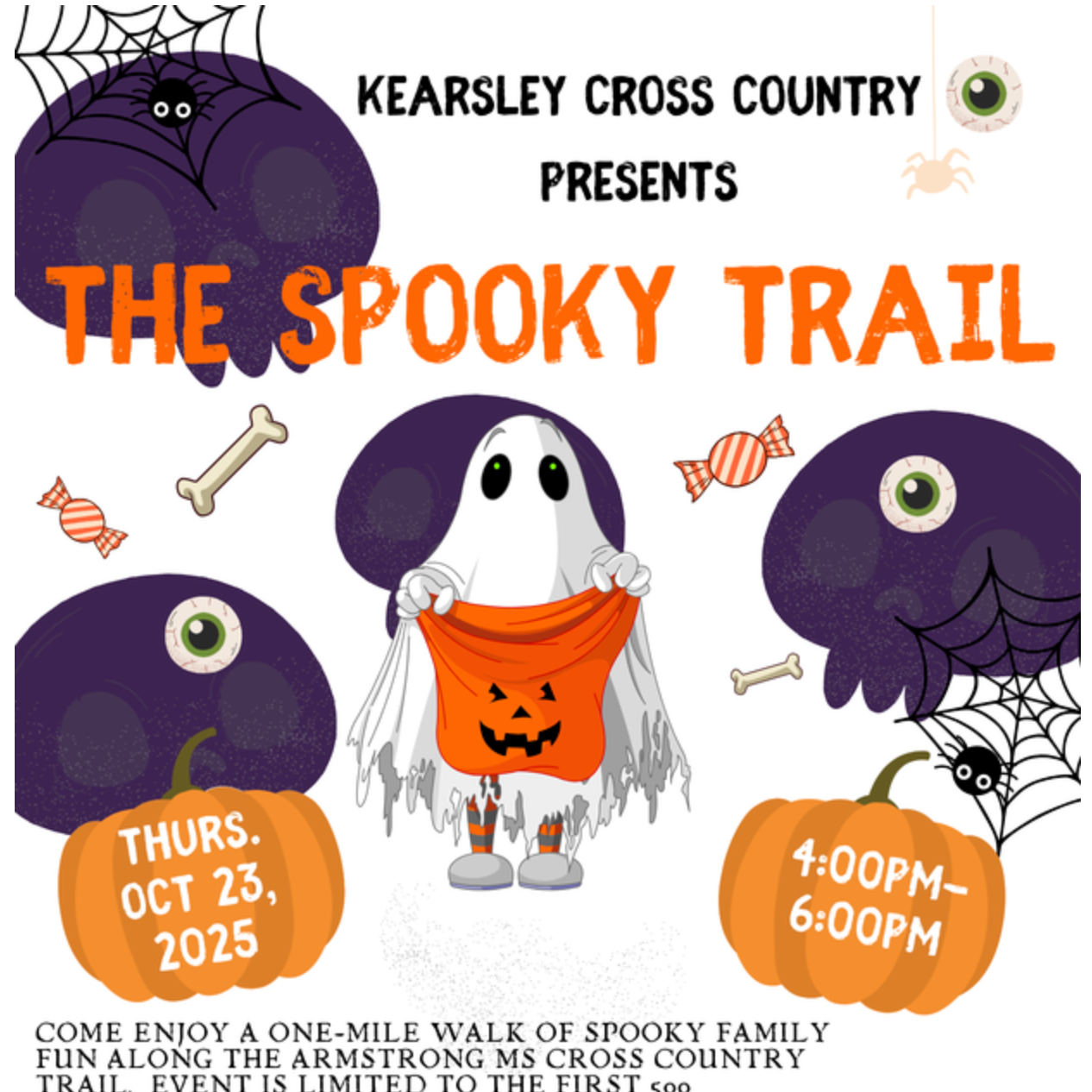 Join us for a one-mile walk of spooky family fun along the AMS cross country trail. This event is recommended for Pre-K and elementary students and their families. Costumes are encouraged! Enjoy donuts and cider at the end of the trail.